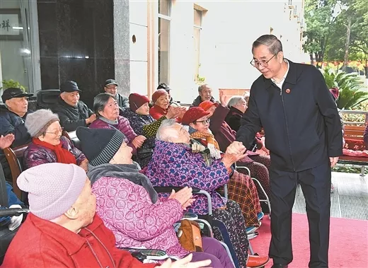 圖為12月12日,全國(guó)政協(xié)副主席、中央代表團(tuán)副團(tuán)長(zhǎng)馬飚在仙源公司夕陽(yáng)紅養(yǎng)老中心看望老人。
